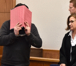 Former nurse, only identified as Niels H., hides his face behind a folder when arriving in the courtroom besides his lawyer Ulrike Baumann, right, in Oldenburg, Germany, Thursday, Feb. 19, ...