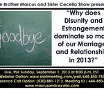 God willing, on this Sunday September 1, 2013 at 8:00 p.m. EST. please join your Relationship Servants, Brother Marcus and Sister Cecelia, as we address the topic of, “Why does Disunity and Estrangement dominate so many of our Marriages and Relatio ...