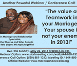 God willing, on this Sunday May 26, 2013 at 8:00 p.m. EST. please join Relationship specialists, Brother Marcus and Sister Cecelia, as we address the topic of, “The value of Teamwork in your Marriage – Your spouse is not your enemy in 2013!” Di ...