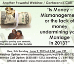 God willing, on this Sunday June 9, 2013 at 8:00 p.m. EST. please join Relationship specialists, Brother Marcus and Sister Cecelia, as we address the topic of, “Is Money – Mismanagement or the lack of money undermining your marriage in 2013?” M ...