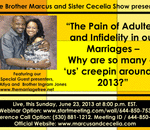 God willing, on this Sunday June 23, 2013 at 8:00 p.m. EST. please join your Relationship Servants, Brother Marcus and Sister Cecelia, as we address the topic of, “The Pain of Adultery and Infidelity in Marriages – Why are so many of ‘us’ cre ...