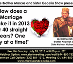 God willing, on this Sunday July 28, 2013 at 8:00 p.m. EST. please join your Relationship Servants, Brother Marcus and Sister Cecelia, as we address the topic of, “How does a Marriage make it in 2013 for 40 straight years? One day at a time!” Thi ...