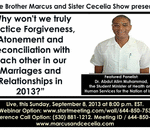 God willing, on this Sunday September 8, 2013 at 8:00 p.m. EST. please join your Relationship Servants, Brother Marcus and Sister Cecelia, as we address the topic of, “Why won't we truly practice Forgiveness, Atonement and Reconciliation with each other in our Marriages and Relationships in 2013?” H ...
