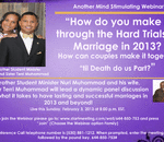 Allah (God) willing, on this Sunday February 10, 2013 at 8:00 p.m. EST. please join Brother Marcus and Sister Cecelia as we interview Brother Nuri Muhammad and his wife, Sister Terri Muhammad on what it takes to be successful in marriage in 2013. How ...