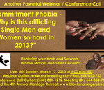 God willing, on this Sunday March 17, 2013 at 8:00 p.m. EST. please join Brother Marcus and Sister Cecelia as we discuss our new and exciting topic, “Commitment Phobia - Why is this afflicting Single People so hard in 2013?” Are you a Commitment ...