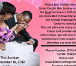 Please join Brother Marcus and Sister Cecelia this Sunday tonight at 8:00 p.m. EST as we conduct the final Conference Call for all of those who are interested in traveling with us to the 3rd Annual Marriage Retreat - Cruise to Jamaica! This call will cover every aspect of the Cruise and provide valu ...