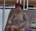 Russian Roulette singer Rihanna skipped the casino and headed straight to the pool while on a trip to Las Vegas. The 22-year-old pop star, who is in Sin City for her Last Girl On Earth tour, showed off her form in a daring animal print swimsuit.