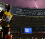 Usain Bolt slows after winning the 100M at the IAAF World Championships as a lightning bolt strikes. The bolt struck shortly after he crossed the finish line.