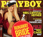 Brokenhearted not, Hugh Hefner is having a little fun after getting jilted by fiancée Crystal Harris. Hefner, 85, Tweeted Wednesday that July's Playboy cover featuring Harris, 25, will be affixed with a sticker that reads, "Runaway bride in this iss ...
