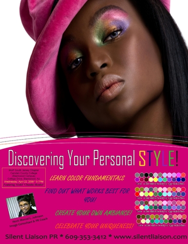 Image Workshop Flyer for April 22nd at 5PM at Camden County College, Blackwood Campus in New Jersey in honor of Administrative Professionals Week. Join us for a FREE color analysis and tips on looking your absolute best even in a down economy!