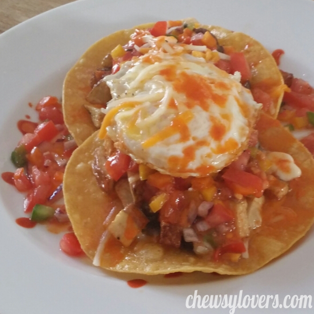4. To assemble the dish, place a spoonful of salsa on the plate first and top with one tortilla. Then add potatoes, steak, and another spoon of salsa. Add another tortilla and top with a little more salsa and a fried egg. (I like mine fried hard, but that’s just me.)