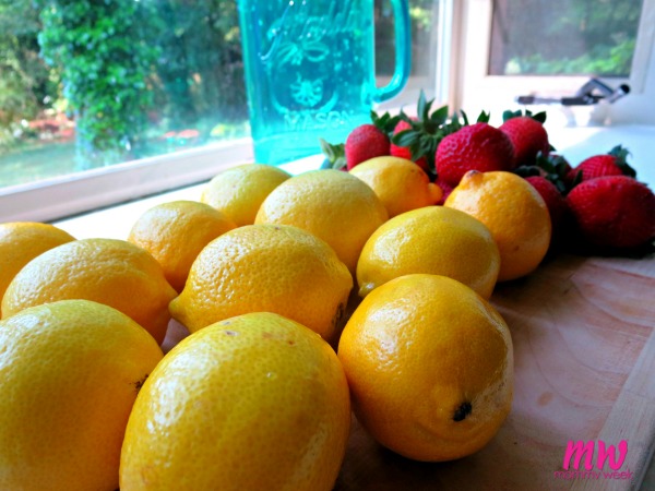 I shop for fruits and veggies weekly at my local farmers market. I picked up these lemons, strawberries, and even added some mint. The mint is totally optional, but it helps take your Strawberry Lemonade to the next level!