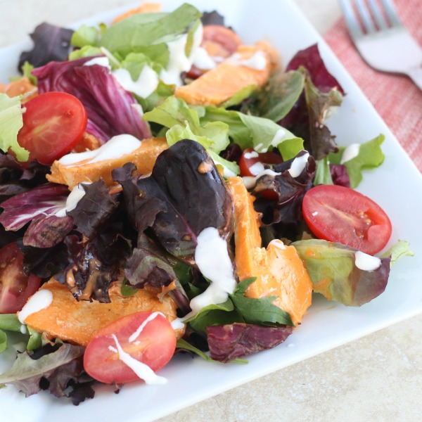 Buffalo Wings and Fries are probably my most favorite guilty pleasure, and I’m not talking about baked wings and oven baked fries! Fried, crispy goodness is what I’m talking about, but that’s not something I can eat everyday. This salad however, gives me the same taste I love, and I can eat it as often as I want. If you like hot wings, you’ll love this salad.