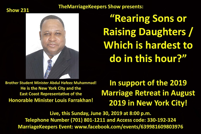 God willing, this Sunday, June 30, 2019, at 8:00 p.m. EST., please join theMarriageKeepers as we once again welcome, Brother Student Regional Minister, Abdul Hafeez Muhammad, the East Coast Regional Student Representative of the Honorable Minister Louis Farrakhan at the show! We are going to discuss with us, “Rearing Sons or Raising Daughters / Which is hardest to do in this hour?"