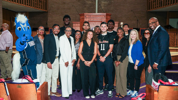 Pictured: Former Dallas Mavericks CEO Cynt Marshall, Paul Quinn students currently enrolled in the new Sports Management major, and Paul Quinn President Dr. Michael J. Sorrell.