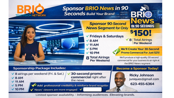 - Professionally crafted content created on your behalf - High‑impact ads built to attract, engage, and convert - Custom images and branded visuals - Access to Brio Network Television’s distribution ecosystem - A turnkey visibility system that works even when you’re not