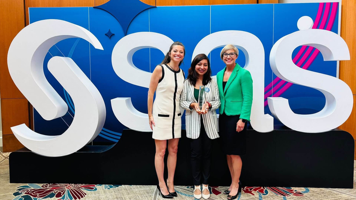 Photo cutline: Harmandeep Sharma, Ph.D., center, research assistant professor in the Department of Natural Resources and Environmental Design at North Carolina Agricultural and Technical State University, holds her trophy for winning the SAS Community Upward Award. Sharma is with Alisa Marin left, customer success manager at SAS, and Jennifer Bell, SAS director of educational partnerships, at the SAS Innovate Conference on May 7 in Orlando, Florida.